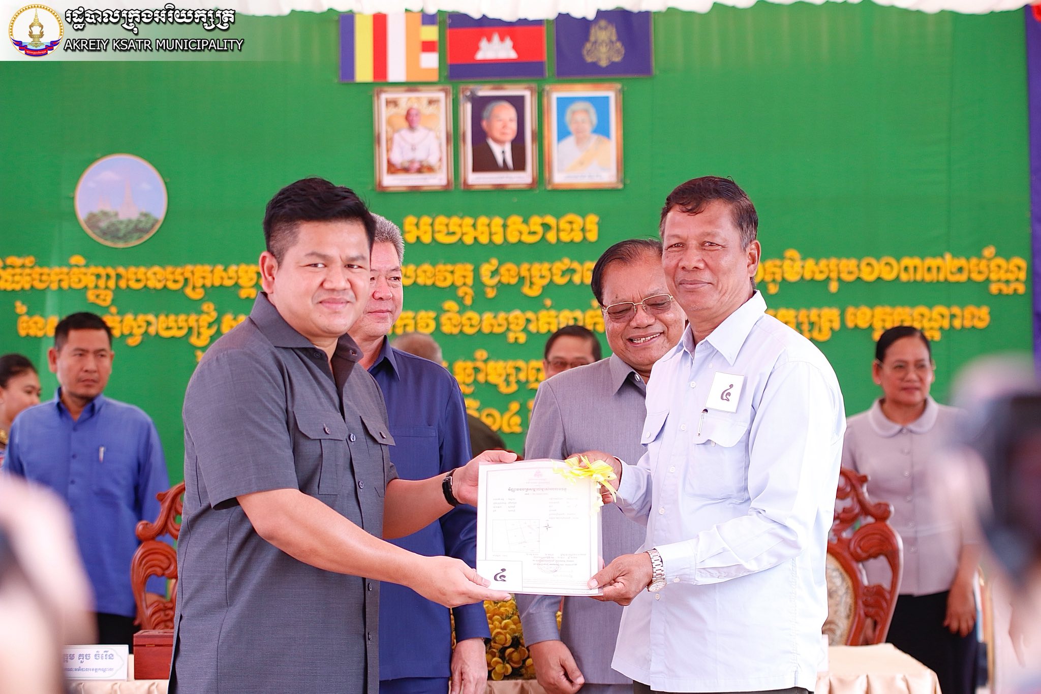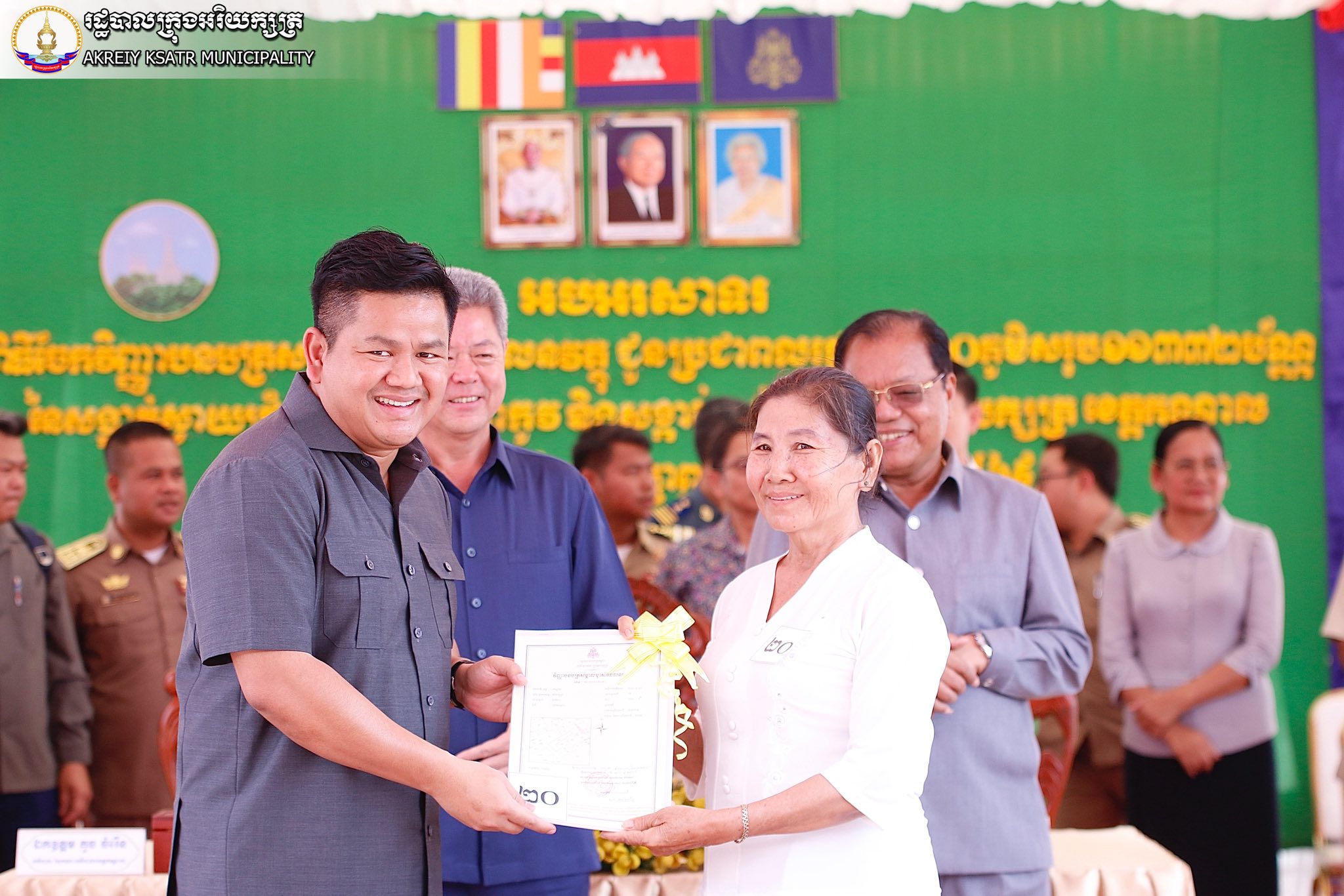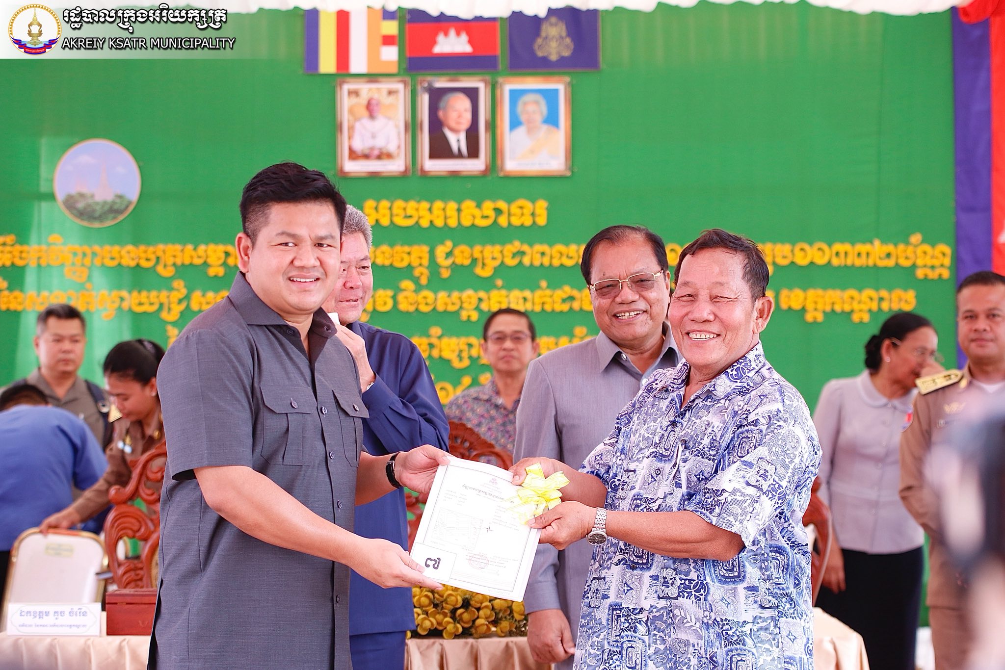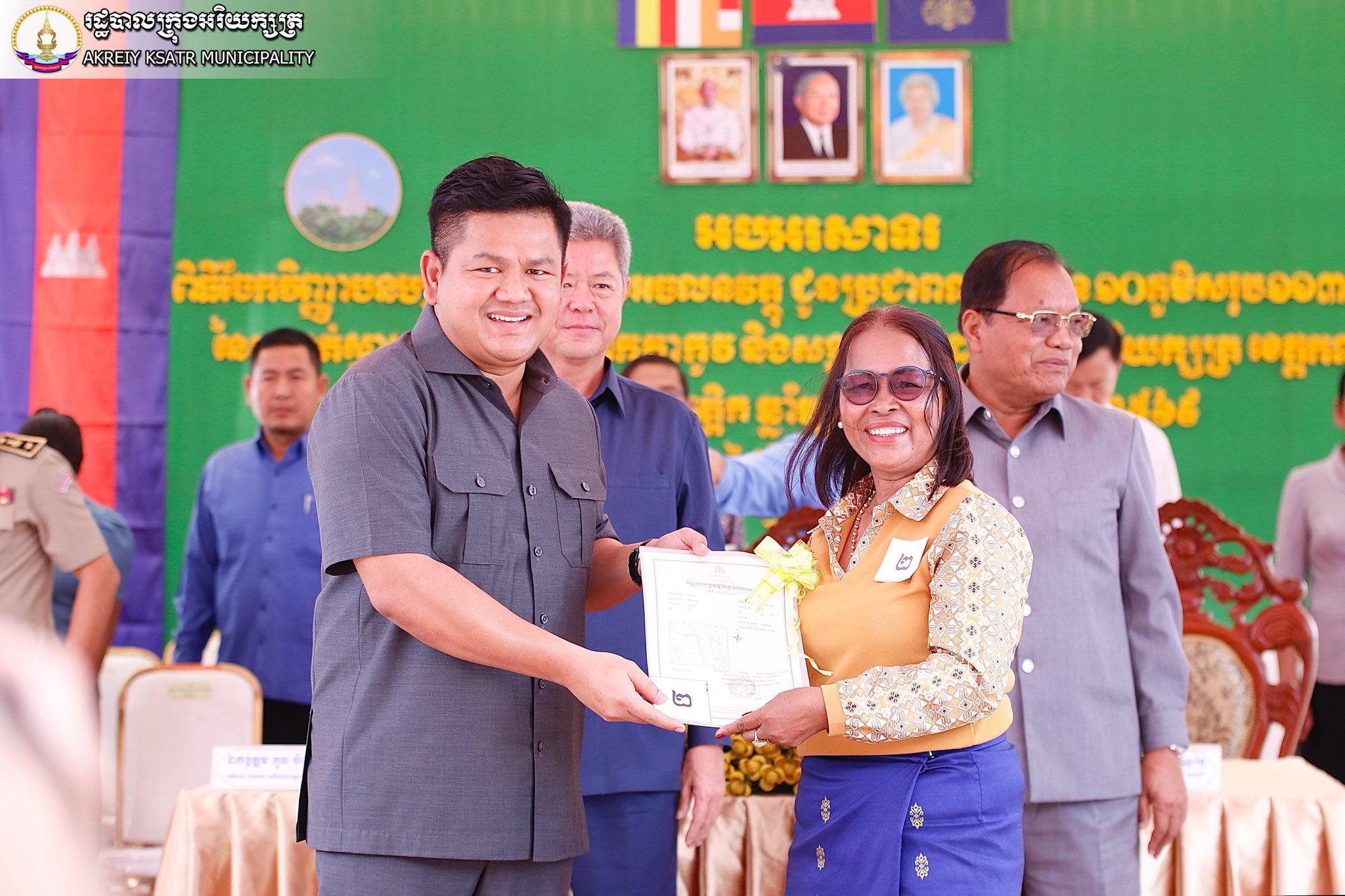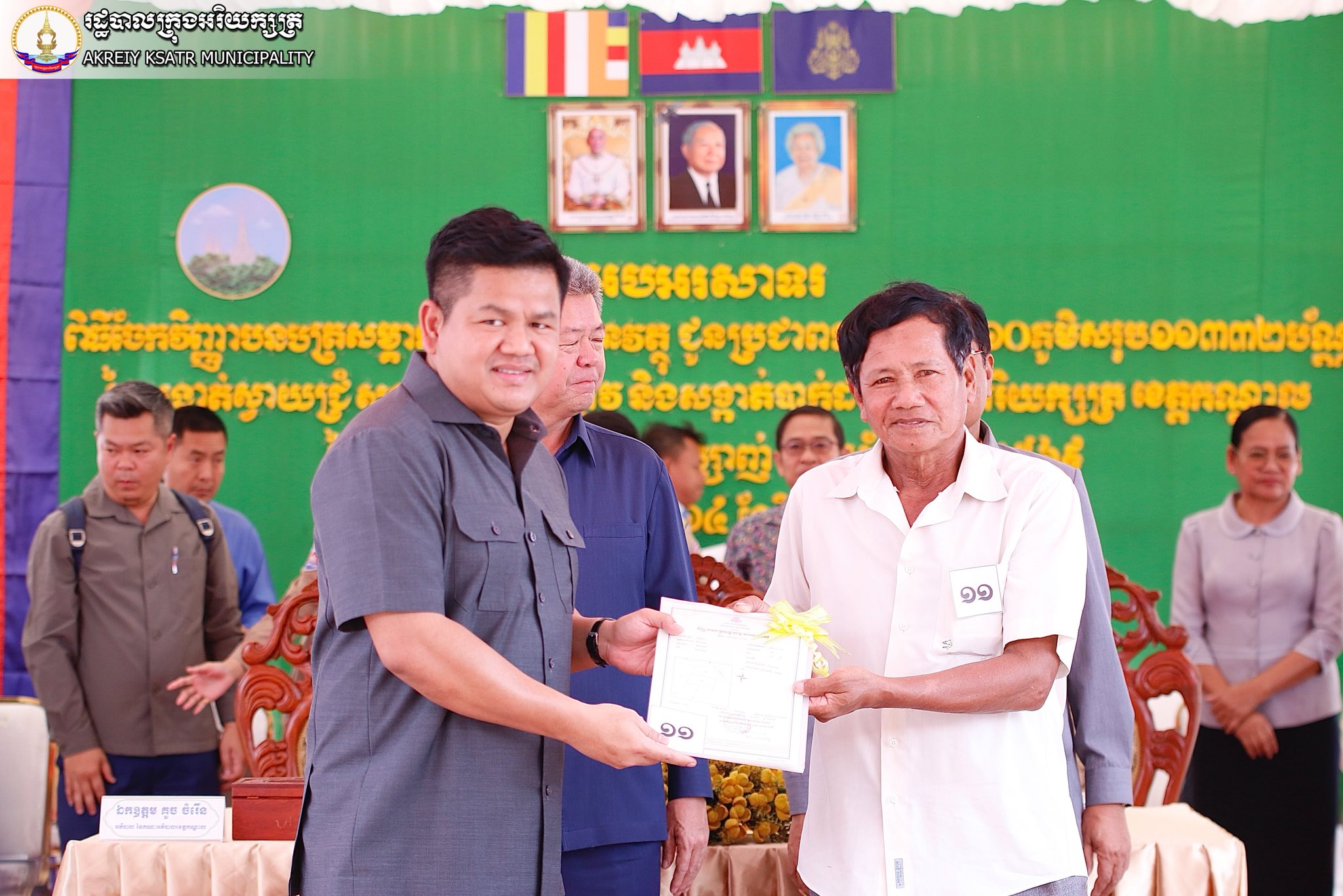 ពិធីចែកវិញ្ញាបនបត្រសម្គាល់ម្ចាស់អចលនវត្ថុចំនួន ១១,៣៣២ប័ណ្ណ ជូនប្រជាពលរដ្ឋចំនួន ១០ភូមិ នៃសង្កាត់ស្វាយជ្រំ សង្កាត់ព្រែកតាកូវ និងសង្កាត់បាក់ដាវ ក្រុងអរិយក្សត្រ ខេត្តកណ្តាល ក្រោមអធិបតីភាពដ៏ខ្ពង់ខ្ពស់ ឯកឧត្តមឈឿន ប៊ុណ្ណារ័ត្ន រដ្ឋលេខាធិការក្រសួងដែនដី នគររូបនីយកម្ម និងសំណង់ ឯកឧត្តម នូ សាខន ប្រធានក្រុមប្រឹក្សាខេត្ត និងឯកឧត្តម គួច ចំរេីន អភិបាល នៃគណ:អភិបាលខេត្តកណ្ដាល ដែលពិធីនេះប្រារព្ធធ្វេីឡេីងនៅបរិវេនសាលាក្រុងអរិយក្សត្រ ។