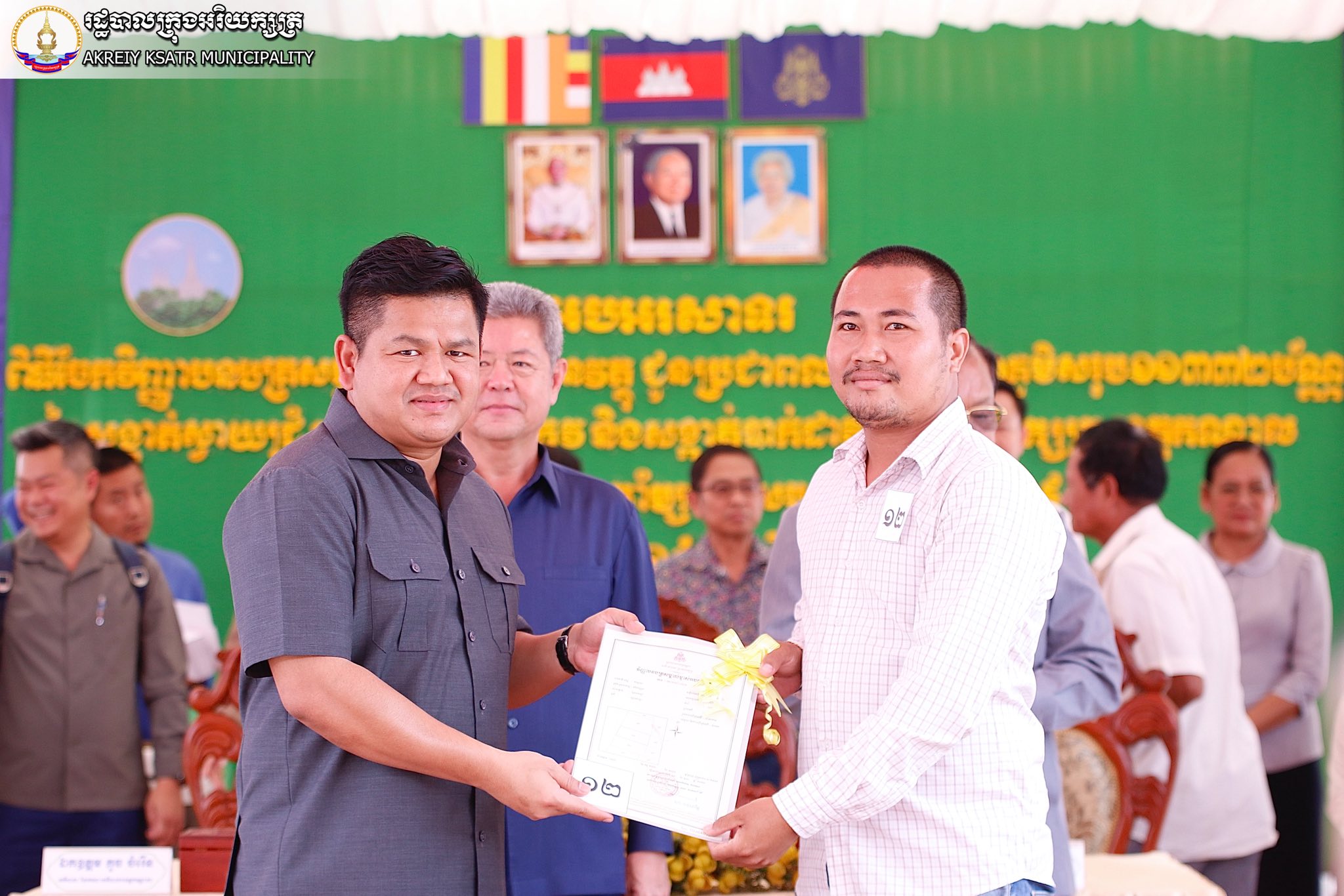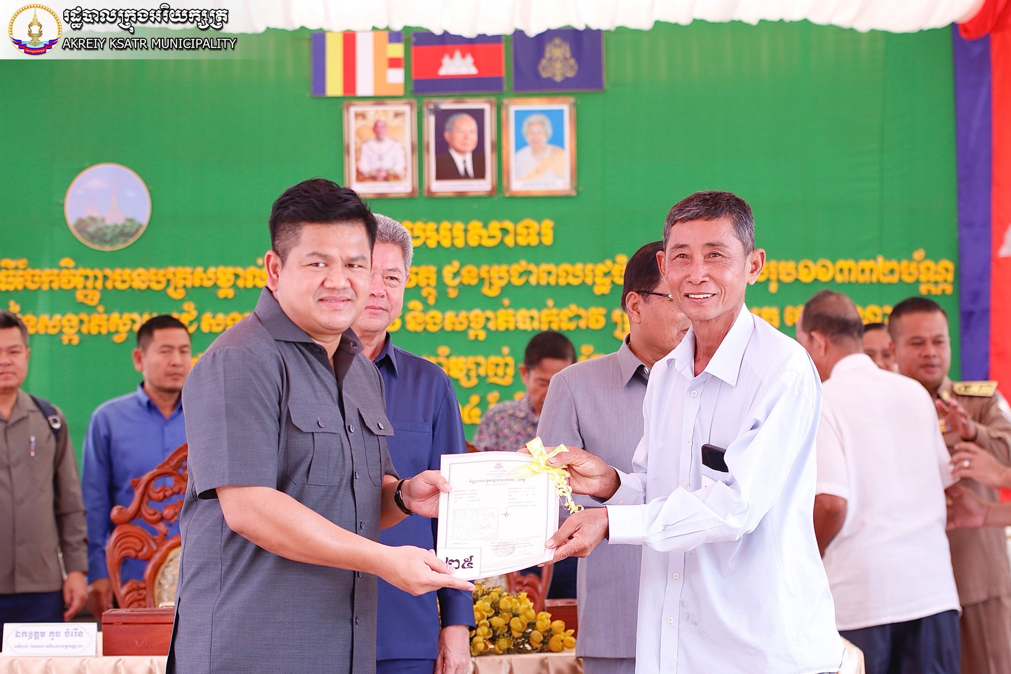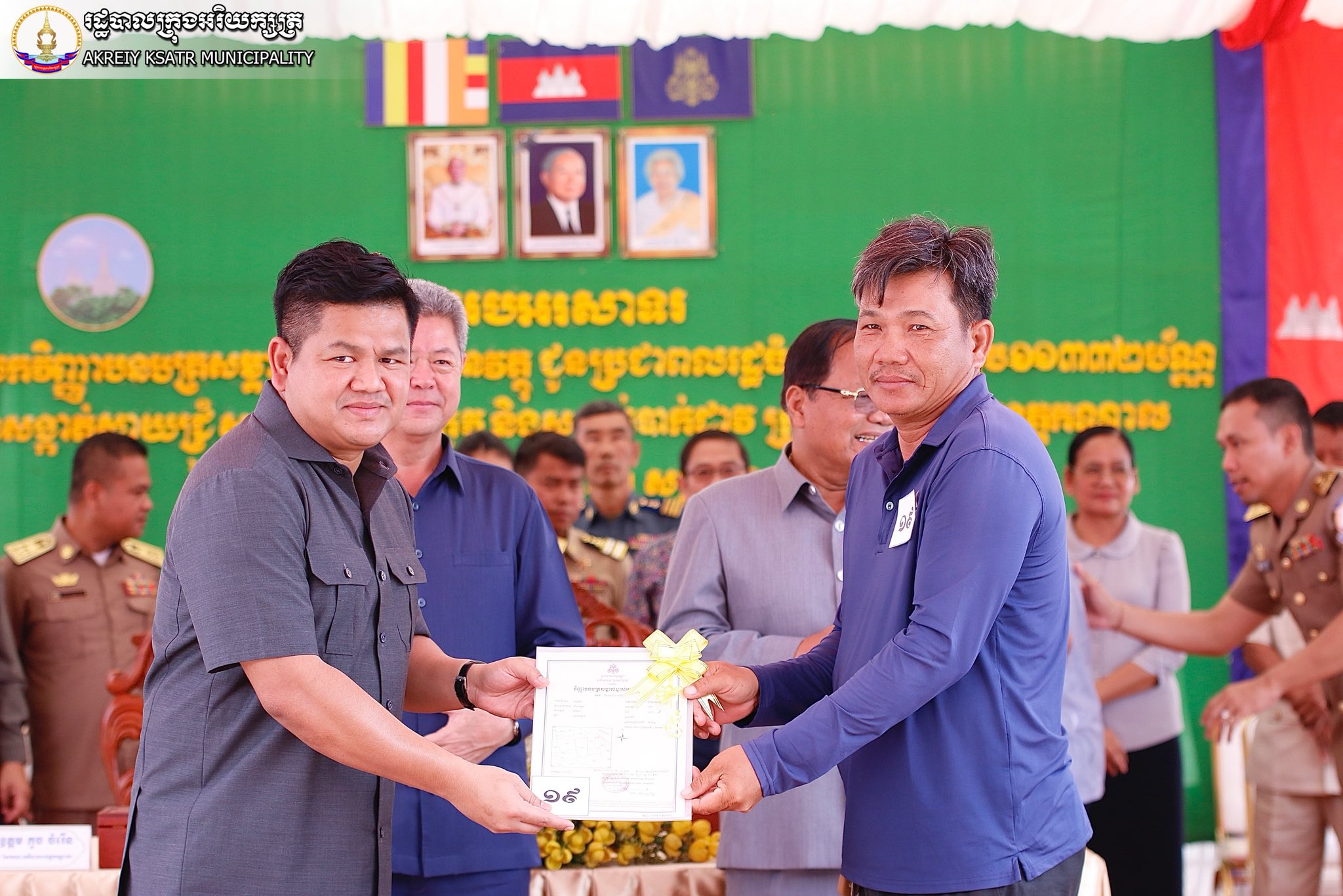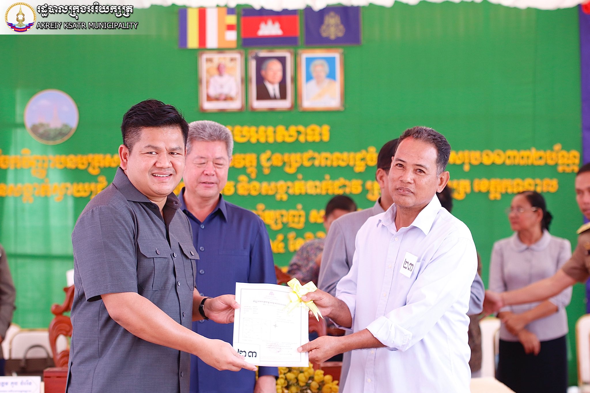 ពិធីចែកវិញ្ញាបនបត្រសម្គាល់ម្ចាស់អចលនវត្ថុចំនួន ១១,៣៣២ប័ណ្ណ ជូនប្រជាពលរដ្ឋចំនួន ១០ភូមិ នៃសង្កាត់ស្វាយជ្រំ សង្កាត់ព្រែកតាកូវ និងសង្កាត់បាក់ដាវ ក្រុងអរិយក្សត្រ ខេត្តកណ្តាល ក្រោមអធិបតីភាពដ៏ខ្ពង់ខ្ពស់ ឯកឧត្តមឈឿន ប៊ុណ្ណារ័ត្ន រដ្ឋលេខាធិការក្រសួងដែនដី នគររូបនីយកម្ម និងសំណង់ ឯកឧត្តម នូ សាខន ប្រធានក្រុមប្រឹក្សាខេត្ត និងឯកឧត្តម គួច ចំរេីន អភិបាល នៃគណ:អភិបាលខេត្តកណ្ដាល ដែលពិធីនេះប្រារព្ធធ្វេីឡេីងនៅបរិវេនសាលាក្រុងអរិយក្សត្រ ។