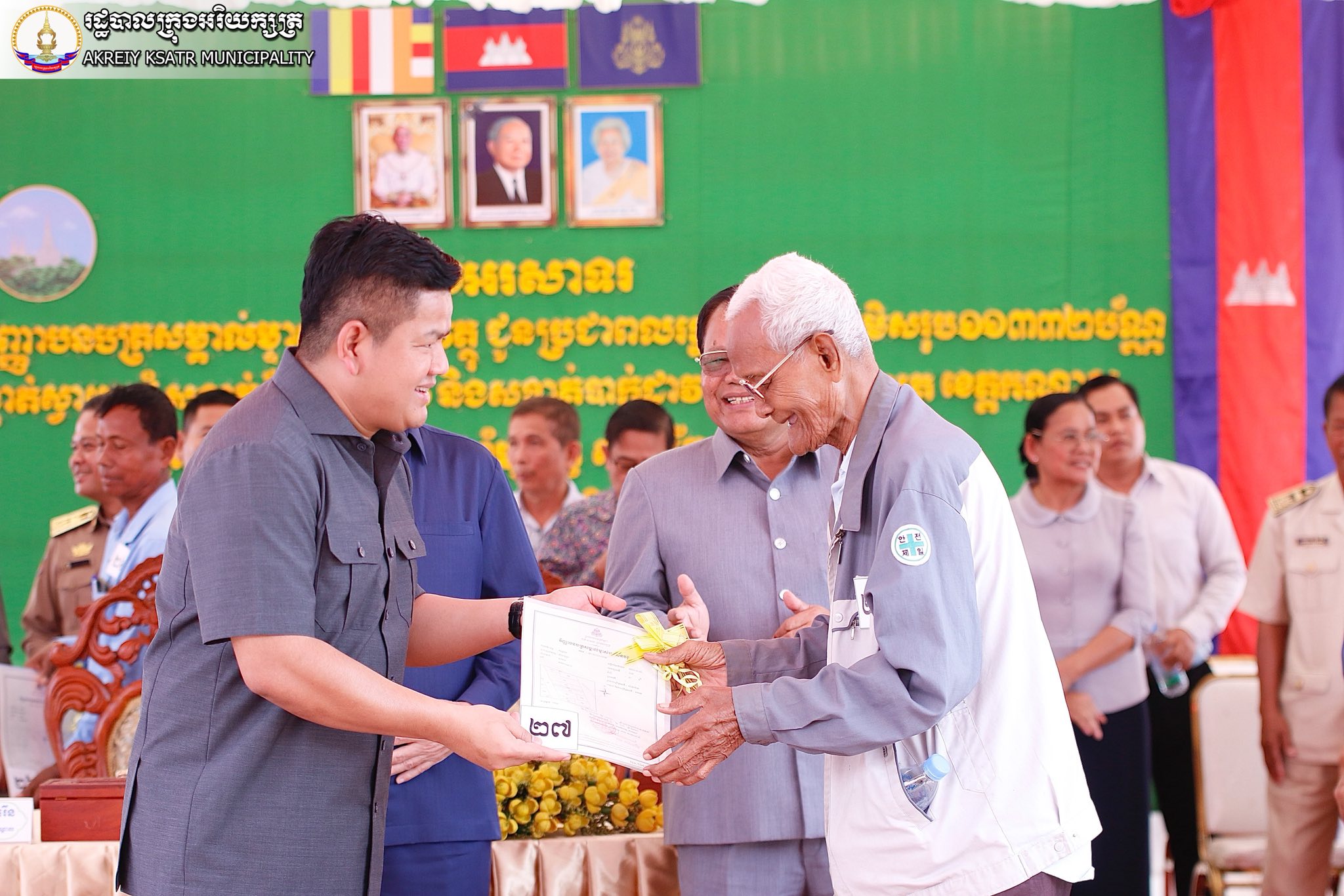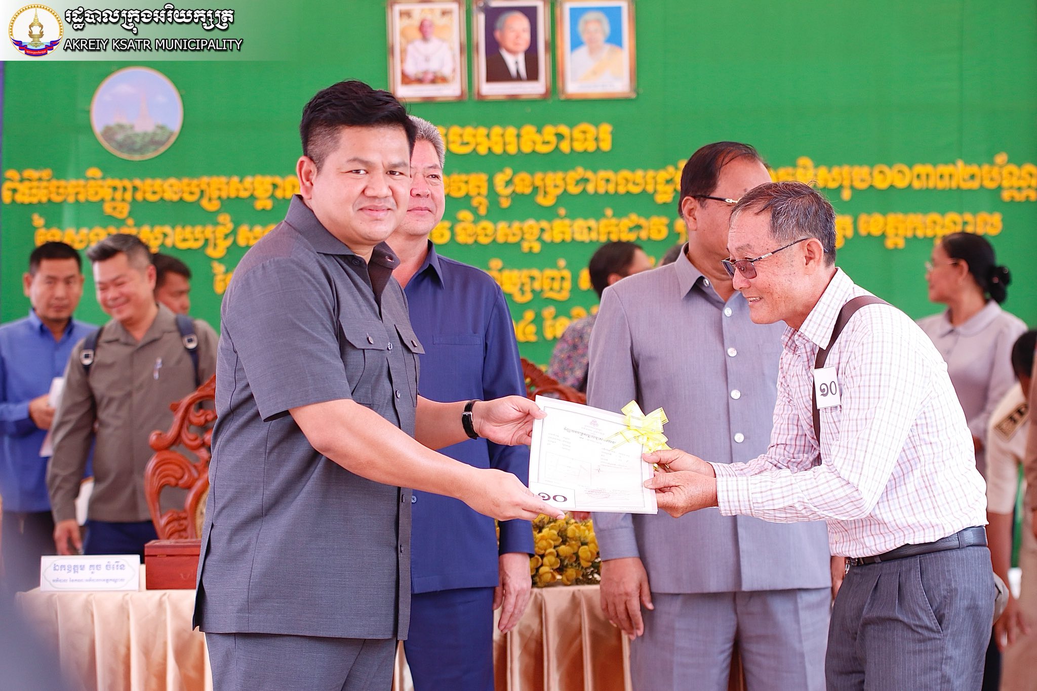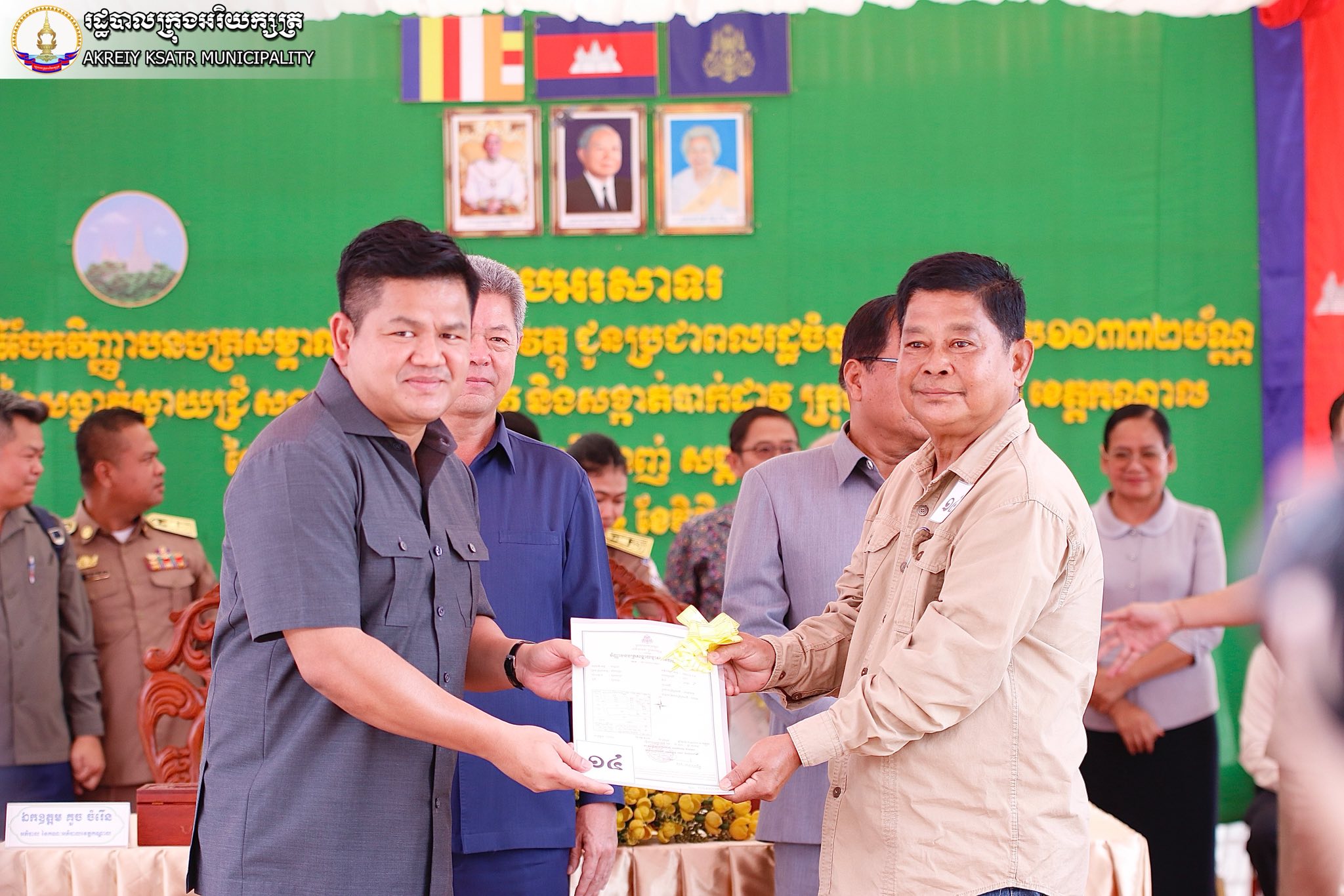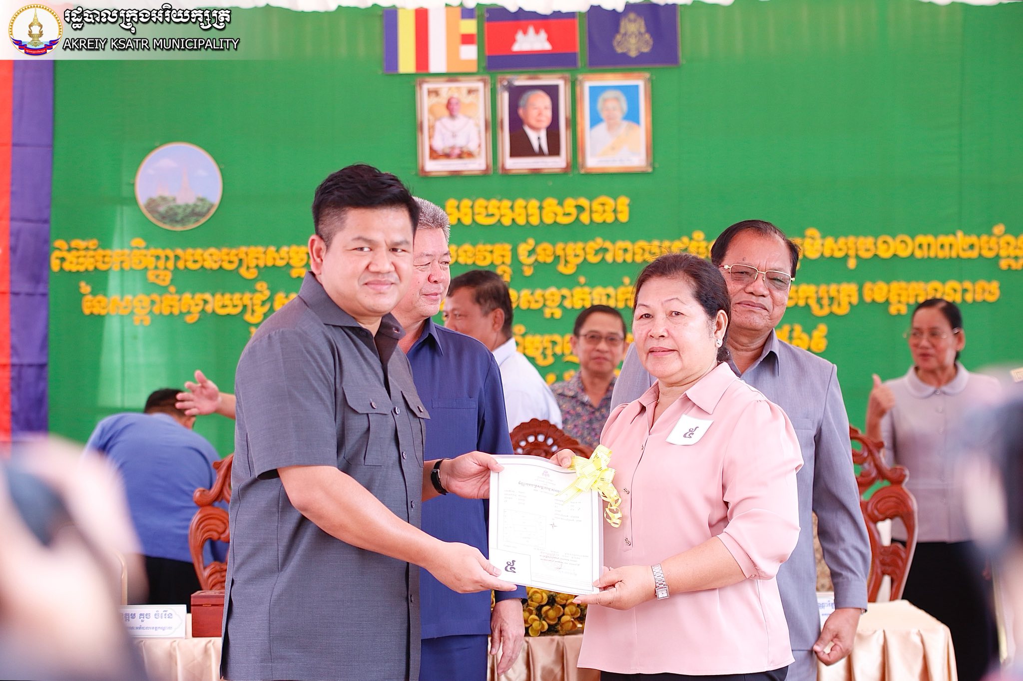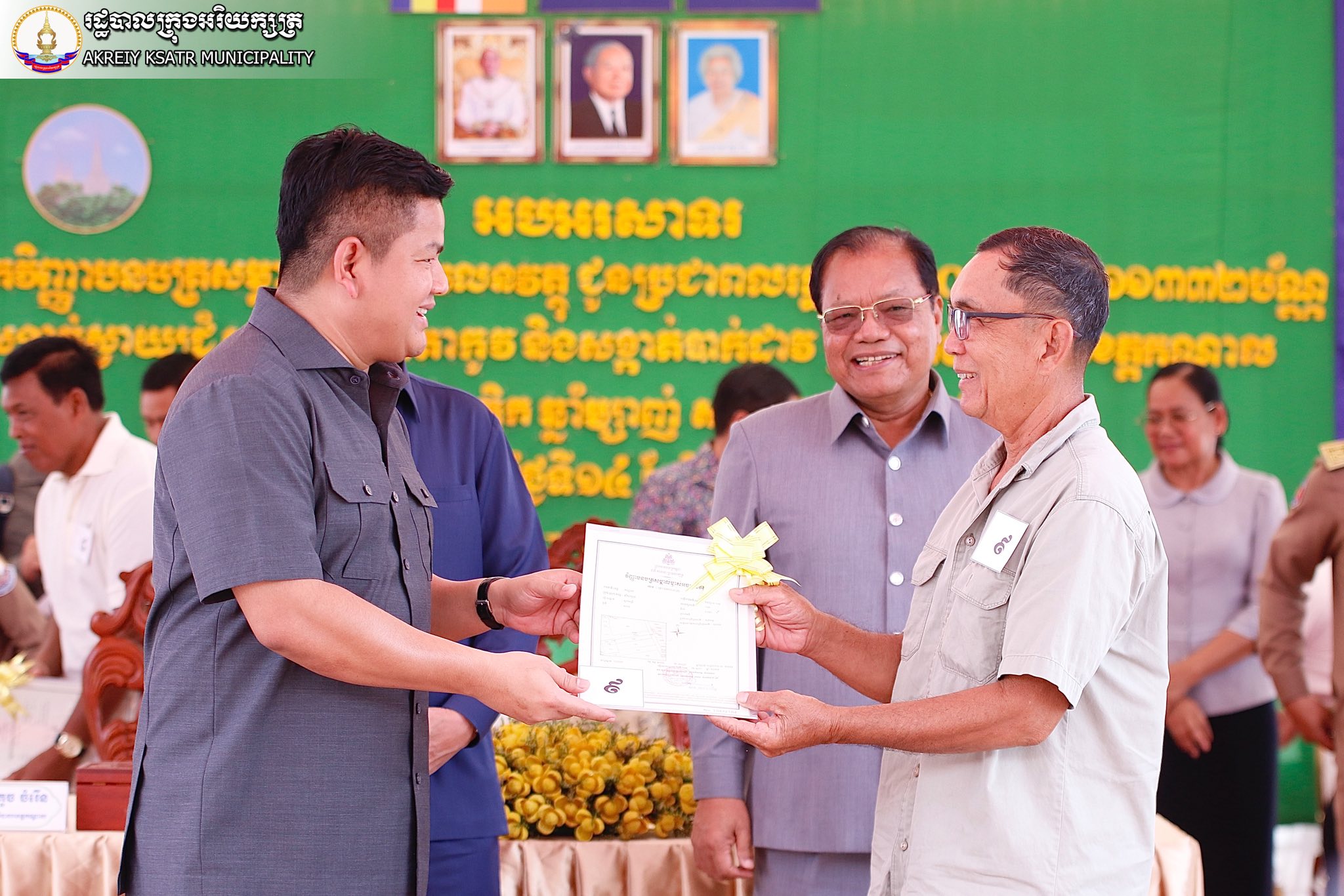 ពិធីចែកវិញ្ញាបនបត្រសម្គាល់ម្ចាស់អចលនវត្ថុចំនួន ១១,៣៣២ប័ណ្ណ ជូនប្រជាពលរដ្ឋចំនួន ១០ភូមិ នៃសង្កាត់ស្វាយជ្រំ សង្កាត់ព្រែកតាកូវ និងសង្កាត់បាក់ដាវ ក្រុងអរិយក្សត្រ ខេត្តកណ្តាល ក្រោមអធិបតីភាពដ៏ខ្ពង់ខ្ពស់ ឯកឧត្តមឈឿន ប៊ុណ្ណារ័ត្ន រដ្ឋលេខាធិការក្រសួងដែនដី នគររូបនីយកម្ម និងសំណង់ ឯកឧត្តម នូ សាខន ប្រធានក្រុមប្រឹក្សាខេត្ត និងឯកឧត្តម គួច ចំរេីន អភិបាល នៃគណ:អភិបាលខេត្តកណ្ដាល ដែលពិធីនេះប្រារព្ធធ្វេីឡេីងនៅបរិវេនសាលាក្រុងអរិយក្សត្រ ។