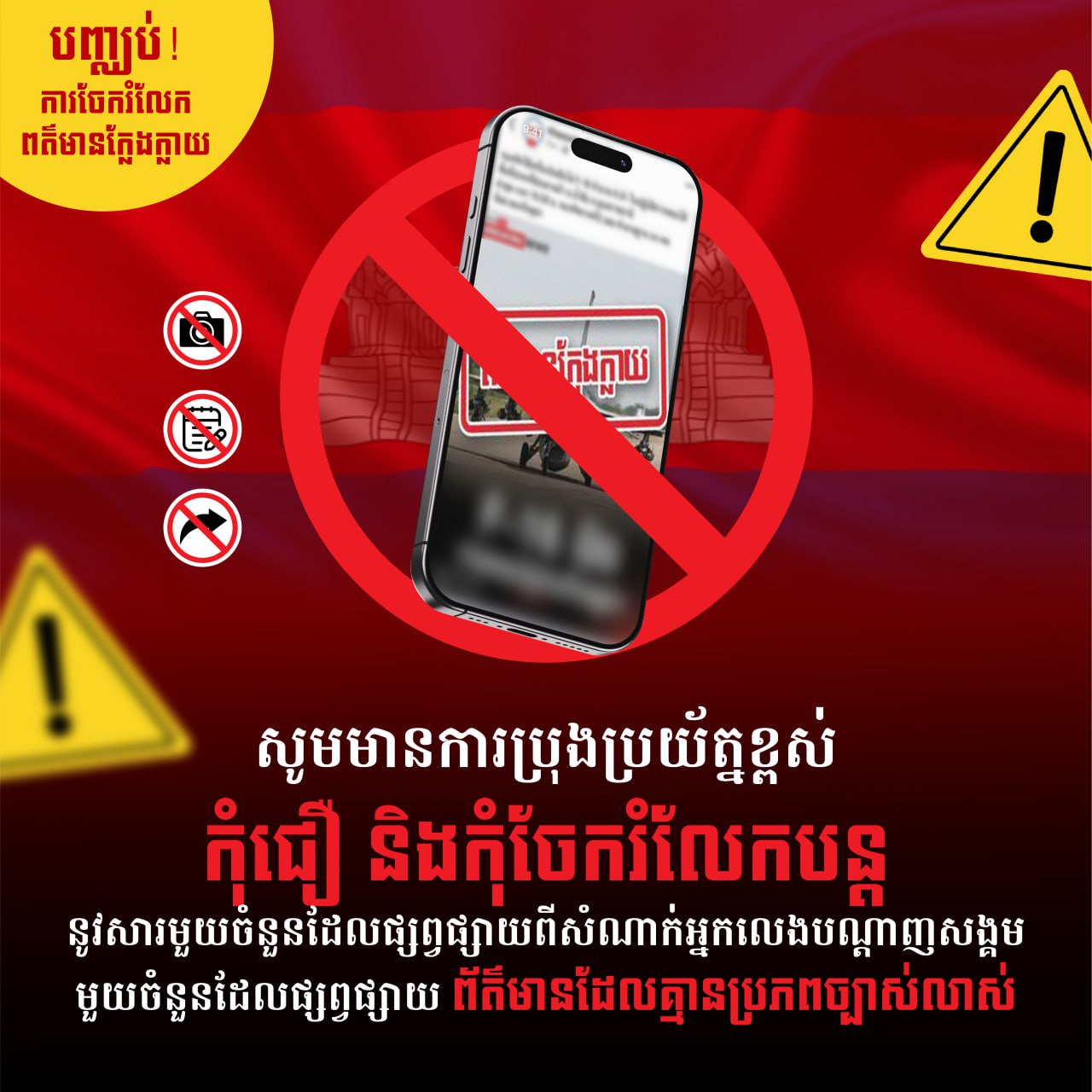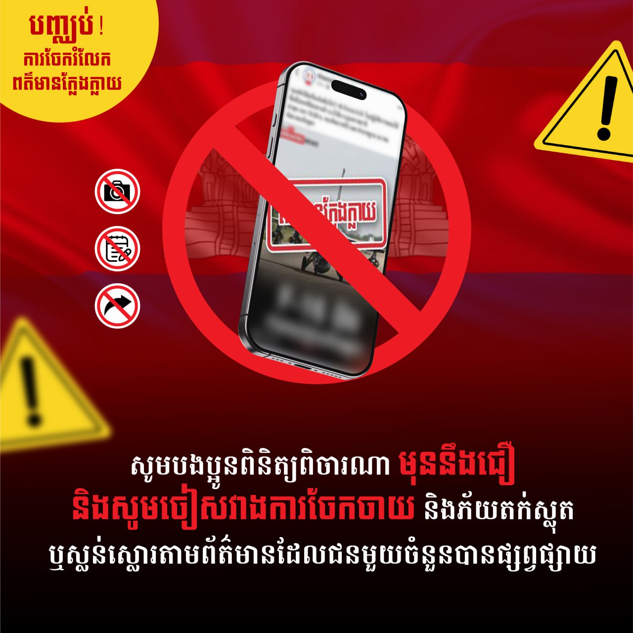 ក្នុងកាលៈទេសៈនេះ សូមតាមដាន និងទទួលនូវព័ត៌មាន ពីប្រភពផ្លូវការនានា ពិសេសគឺក្រសួងការពារជាតិBy សហការី / 12/11/2025 ក្នុងកាលៈទេសៈនេះ សូមតាមដាន និងទទួលនូវព័ត៌មាន ពីប្រភពផ្លូវការនានា ពិសេសគឺក្រសួងការពារជាតិ ដែលផ្តល់ព័ត៌មានពិត និងមានប្រភពច្បាស់លាស់ពីសមរភូមិមុខ និងពីអាជ្ញាធរខេត្តពាក់ព័ន្ធ