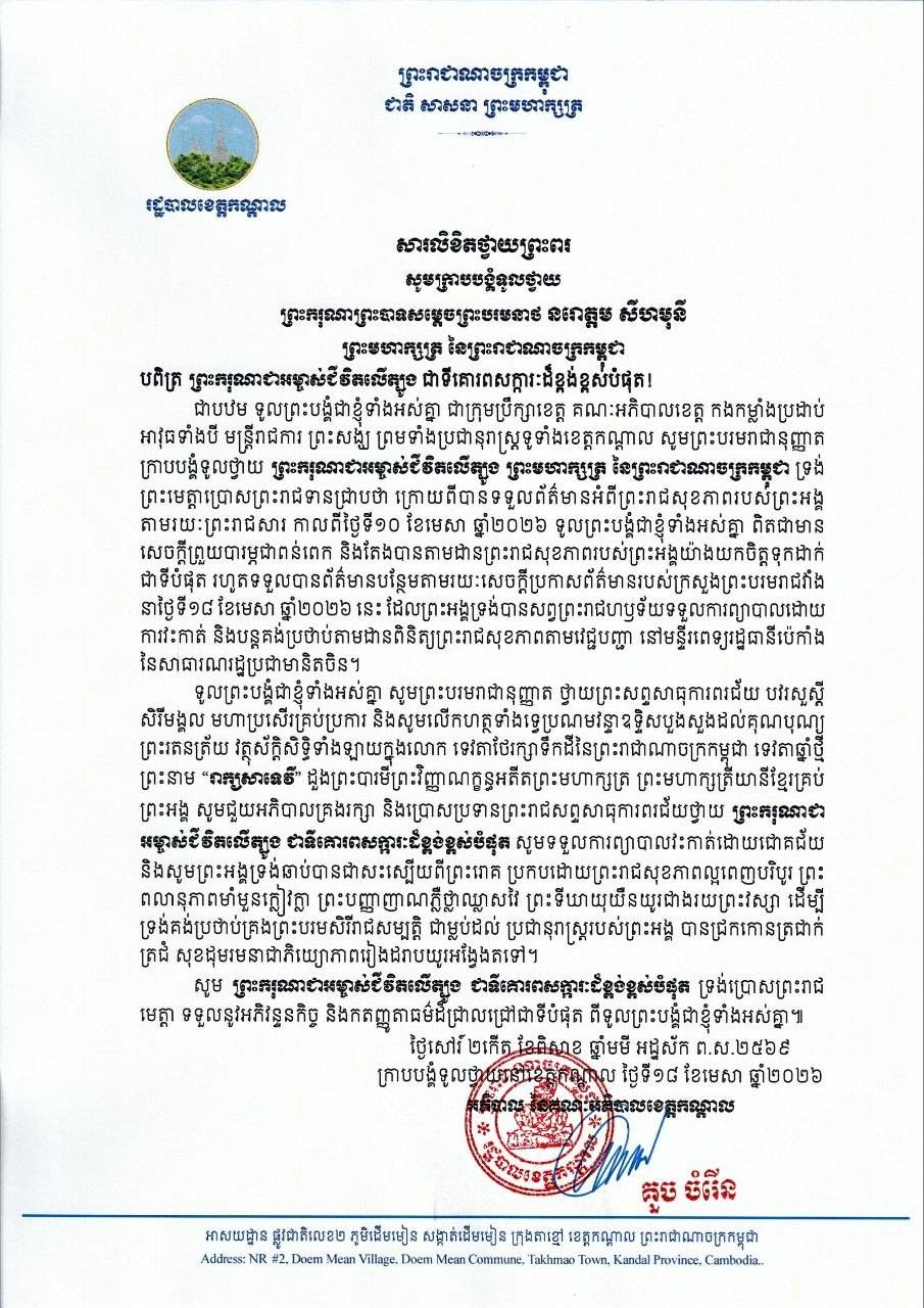 ក្រុមប្រឹក្សាខេត្ត គណៈអភិបាលខេត្ត កងកម្លាំងប្រដាប់អាវុធទាំងបី មន្ត្រីរាជការ ព្រះសង្ឃ ព្រមទាំងប្រជានុរាស្ត្រទូទាំងខេត្តកណ្តាល សូមព្រះបរមរាជានុញ្ញាត ថ្វាយព្រះសព្ទសាធុការពរជ័យ បវរសួស្តី សិរីមង្គល មហាប្រសើរគ្រប់ប្រការ និងសូមលើកហត្ថទាំងទ្វេប្រណមវន្ទាឧទ្ទិសបួងសួងដល់គុណបុណ្យ ព្រះរតនត្រ័យ វត្ថុស័ក្តិសិទ្ធិទាំងឡាយក្នុងលោក ទេវតាថែរក្សាទឹកដីនៃព្រះរាជាណាចក្រកម្ពុជា ទេវតាឆ្នាំថ្មី ព្រះនាម “រាក្យសាទេវី” ដួងព្រះបារមីព្រះវិញ្ញាណក្ខន្ធអតីតព្រះមហាក្សត្រ ព្រះមហាក្សត្រិយានីខ្មែរគ្រប់ព្រះអង្គ សូមជួយអភិបាលគ្រងរក្សា និងប្រោសប្រទានព្រះរាជសព្ទសាធុការពរជ័យថ្វាយ ព្រះករុណាជាអម្ចាស់ជីវិតលើត្បូង ជាទីគោរពសក្ការៈដ៏ខ្ពង់ខ្ពស់បំផុត សូមទទួលការព្យាបាលវះកាត់ដោយជោគជ័យ និងសូមព្រះអង្គទ្រង់ឆាប់បានជាសះស្បើយពីព្រះរោគ ប្រកបដោយព្រះរាជសុខភាពល្អពេញបរិបូរ ព្រះពលានុភាពមាំមួនក្លៀវក្លា ព្រះបញ្ញាញាណភ្លឺថ្លាឈ្លាសវៃ ព្រះទីឃាយុយឺនយូរជាងរយព្រះវស្សា ដើម្បីទ្រង់គង់ប្រថាប់គ្រងព្រះបរមសិរីរាជសម្បត្តិ ជាម្លប់ដល់ប្រជានុរាស្ត្ររបស់ព្រះអង្គ បានជ្រកកោនត្រជាក់ ត្រជំ សុខដុមរមនាជាភិយ្យោភាពរៀងដរាបយូរអង្វែងតទៅ។